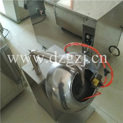 通過鍋體順時(shí)針旋轉(zhuǎn),使糖衣片在鍋內(nèi)翻滾滑移摩擦研磨,通過人手潑入糖衣粉末,使糖衣粉末在全部素片上均勻分布,隨機(jī)附帶的電熱式鼓風(fēng)機(jī),出風(fēng)管伸入球內(nèi)可作加熱,同時(shí)鼓風(fēng)機(jī)向鍋內(nèi)層通以熱風(fēng)除去片劑表層水份,從而得到僵格的糖包衣藥片。