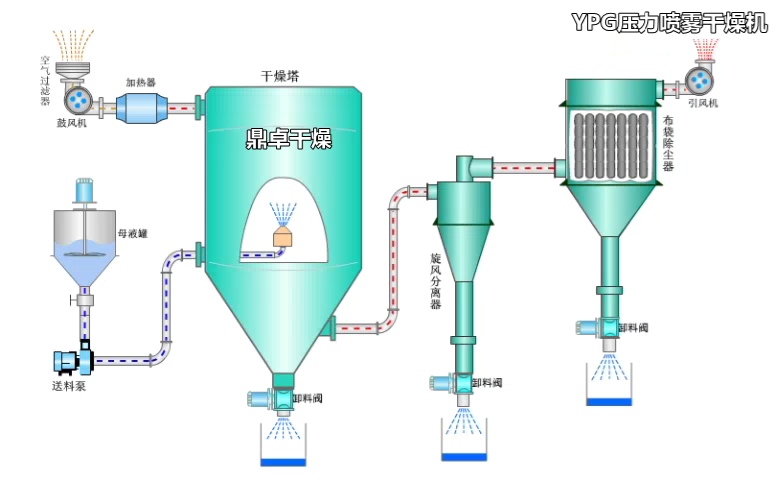 空氣經(jīng)過濾和加熱,進(jìn)入干燥器頂部空氣分配器,熱空氣呈螺旋狀均勻地進(jìn)入干燥室。料液經(jīng)塔體頂部的高速離心霧化器,(旋轉(zhuǎn))噴霧成極細(xì)微的霧狀液珠,與熱空氣并流接觸在極短的時(shí)間內(nèi)可干燥為成品。成品連續(xù)地由干燥塔底部和旋風(fēng)分離器中輸出,廢氣由風(fēng)機(jī)排空。