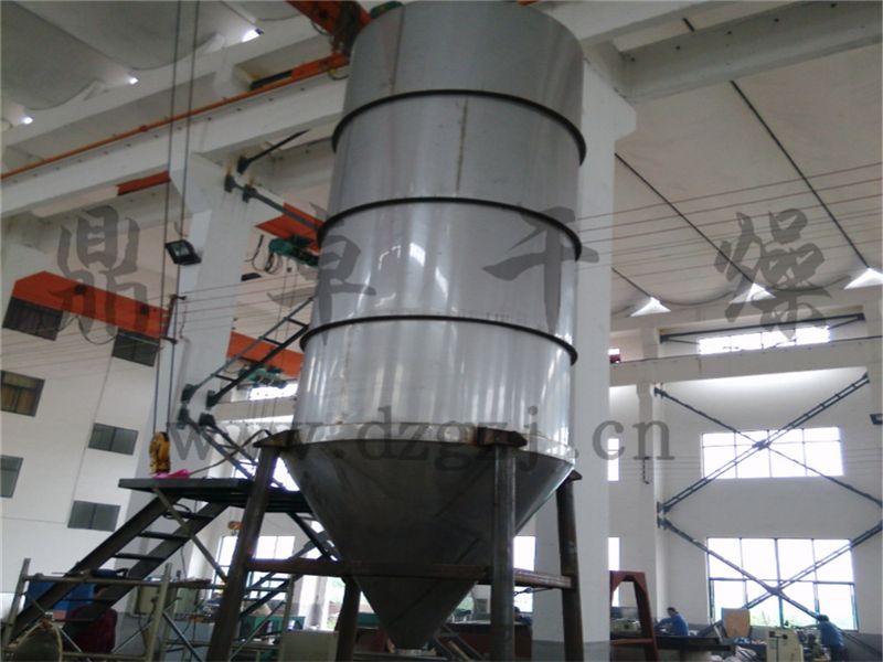 本機組工作過程為料液通過隔膜泵高壓輸入,噴出霧狀液滴,然后同熱空氣并流下降,大部分粉粒由塔底排料口收集,廢氣及其微小粉末經旋風分離器分離,廢氣由抽風機排出,粉末由設在旋風分離器下端的授粉筒收集,風機出口還可裝備二級除塵裝置,回收率在96-98%以上。