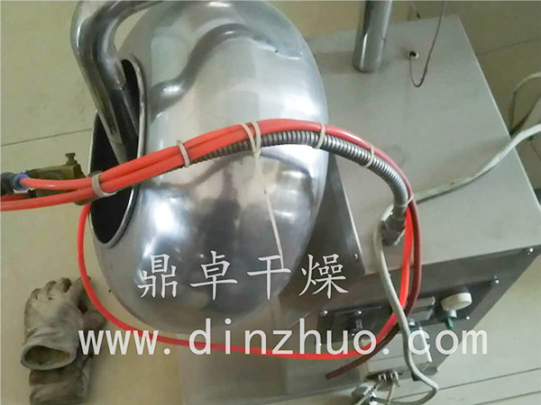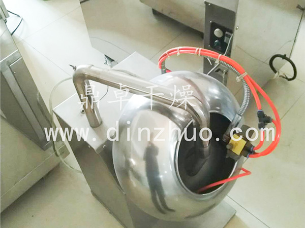 通過鍋體順時(shí)針旋轉(zhuǎn),使糖衣片在鍋內(nèi)翻滾滑移摩擦研磨,通過人手潑入糖衣粉末,使糖衣粉末在全部素片上均勻分布,隨機(jī)附帶的電熱式鼓風(fēng)機(jī),出風(fēng)管伸入球內(nèi)可作加熱,同時(shí)鼓風(fēng)機(jī)向鍋內(nèi)層通以熱風(fēng)除去片劑表層水份,從而得到僵格的糖包衣藥片。