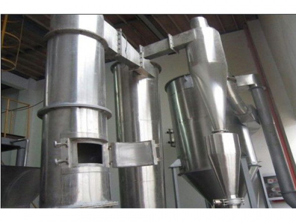 熱空氣由入口管以適宜的噴動(dòng)速度從干燥機(jī)底部進(jìn)入攪拌粉碎干燥室,對(duì)物料產(chǎn)生強(qiáng)烈的剪切、吹浮、旋轉(zhuǎn)作用,于是物料受到離心、剪切、碰撞、摩擦而被微粒化,強(qiáng)化了傳質(zhì)傳熱。在干燥機(jī)底部,較大較濕的顆粒團(tuán)在攪拌器的作用下被機(jī)械破碎,濕含量較低、顆粒度較小的顆粒被旋轉(zhuǎn)氣流夾帶上升,在上升過程中進(jìn)一步干燥。由于氣固兩相作旋轉(zhuǎn)流動(dòng)。固相慣性大于氣相,固氣兩相間的相對(duì)速度較大,強(qiáng)化兩相間的傳質(zhì)傳熱.所以該機(jī)生產(chǎn)強(qiáng)度高。