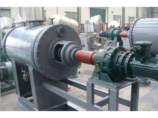 原料經(jīng)輸送泵送至干燥主機(jī)干燥罐體內(nèi),同時,加熱介質(zhì)通過管道泵輸送至干燥機(jī)的加熱夾層內(nèi),原料通過干燥機(jī)器壁獲取熱量而被加熱,在真空系統(tǒng)的作用下逐漸被帶走水分而達(dá)到干燥目的;在原料接近干燥階段,為防止部分粉末被真空泵抽出,設(shè)計采用特制袋濾器收集;原料所含的有機(jī)溶劑通過特殊冷凝器二級冷凝,使整體回收率達(dá)95%以上。